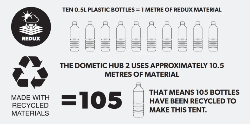 Dometicâs Redux fabric is made completely from Recycled Plastic Bottles, making it one of the most Eco-friendly materials on the market. What was once waste is now re-used to allow us to enjoy nature rather than destroy it. The high-grade polyester material is durable and very waterproof, it has a rip-stop thread running throughout the material to offer reinforcement should it get accidently caught on something.