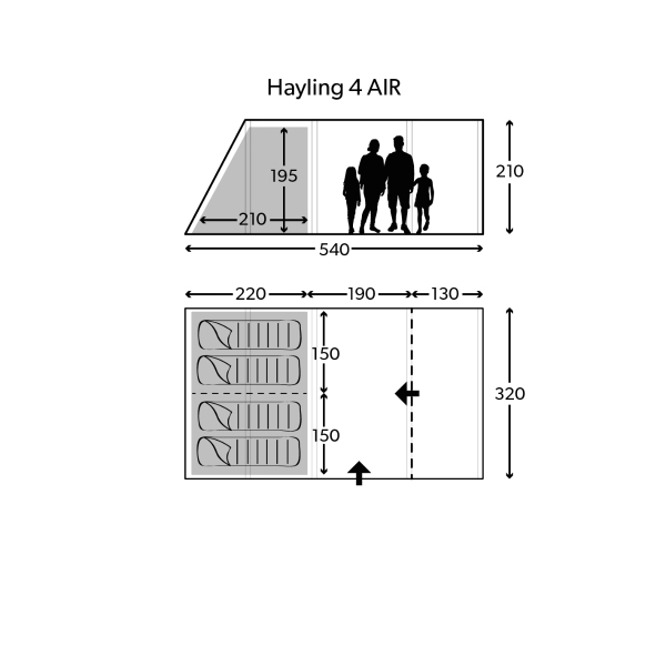 It sleeps up to 4 and offers a large living area, with a great view through panoramic windows. Very quick to set up, the Hayling 4 AIR is great for long or short stays and is ideal for touring. The bedrooms feature a zipped partition between the compartments that can be rolled up to make one large bedroom. The living room has a sewn in groundsheet and a large door in the left hand side with a mesh screen panel to keep the bugs out on warm days.Â