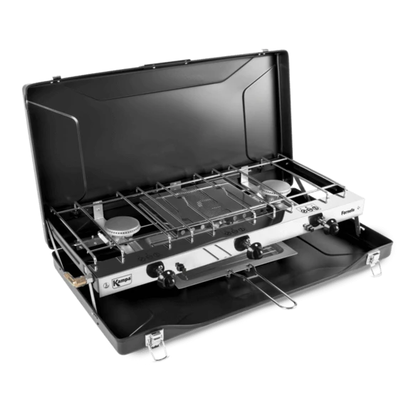 Prepare your favorite meals outdoors with this double burner and grill gas cooker. Its compact profile saves valuable space when packing all of those camping essentials.