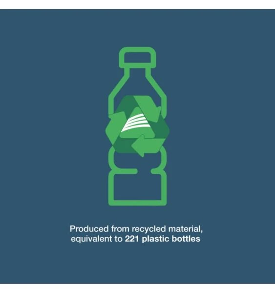 - Produced from recycled material equivalent to 221 plastic bottles