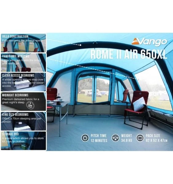 The Vango Rome Air Tent has always been one of our favourite tents and for the new season it has been upgraded to take the tent to a whole new level. A recycled Fabric has been used to make the tent more sustainable. Combined with Vangoās S.I Pro inflation technology the tent suddenly has more premium features. It still comes in two sizes (550XL & 650XL), so you can easily choose how many you need to accommodate. The side storage area allows you to make the most of your living and awning area without tripping over suitcases and clutter, or why not use it as a toilet area so you havenāt got to walk miles in the middle of the night.