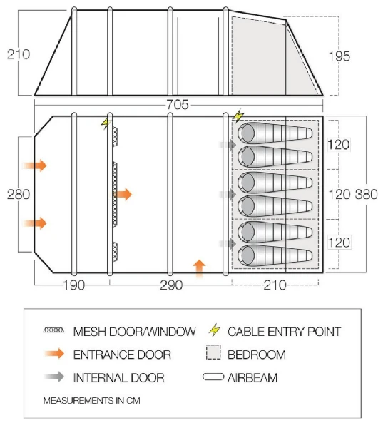 - Inflatable AirBeam® Structure – With 10 years’ experience in AirBeam® technology, we are the leaders in pole free pitching. AirBeam® technology ensures your awning is erect within a matter of minutes (supplied with double action pump)