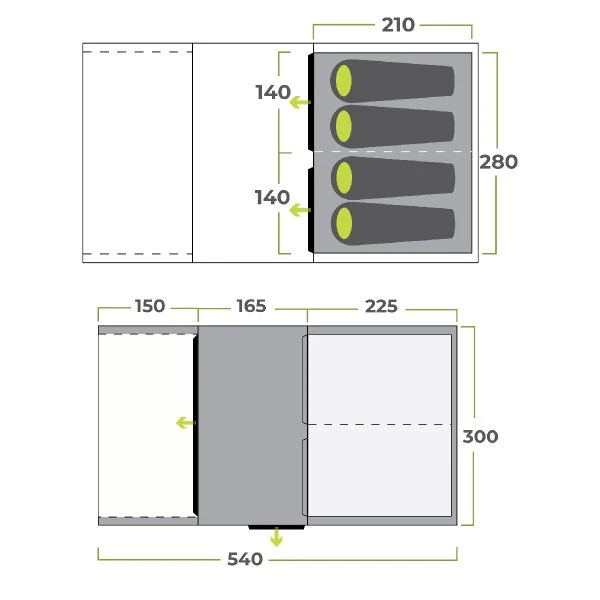 - Bedroom / Inner Features – Twin Layer D Doors (3), Power Cord Access Zip (3), Light Defusing Fabric, Zip Out Dividing Curtain,Â
